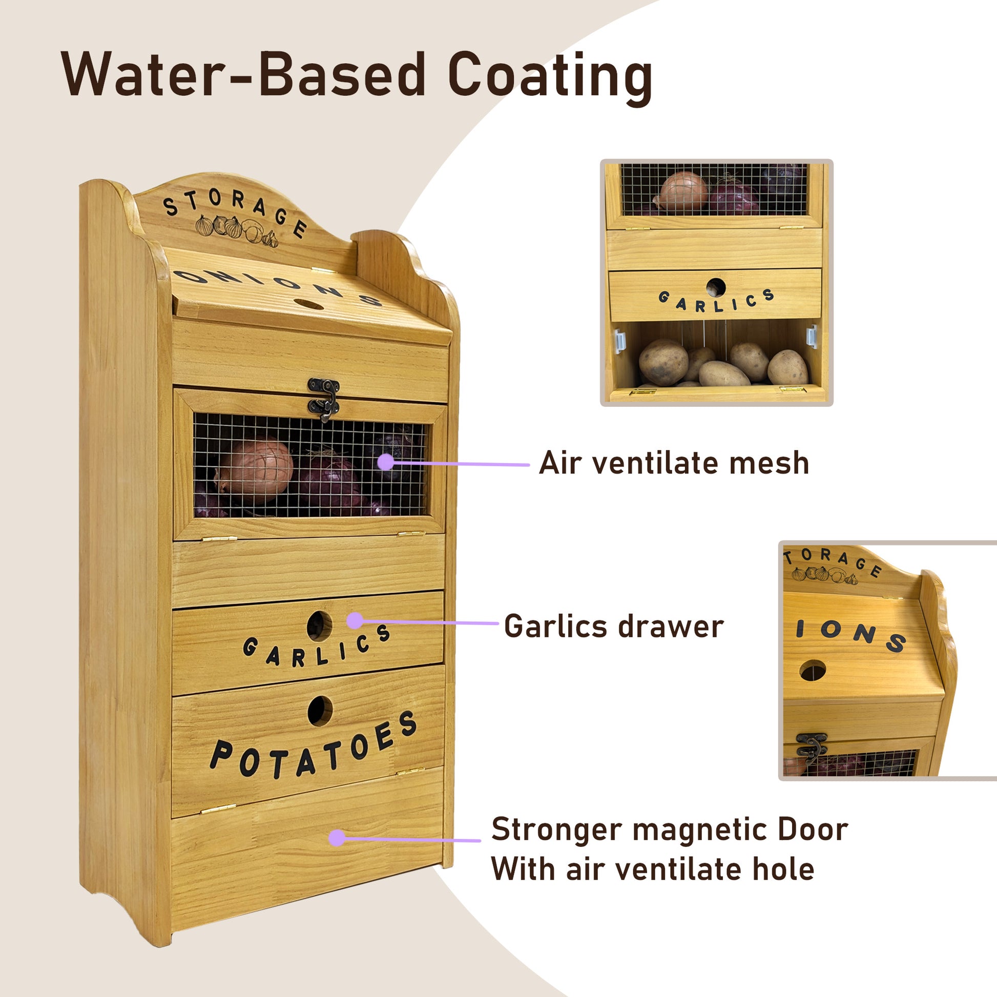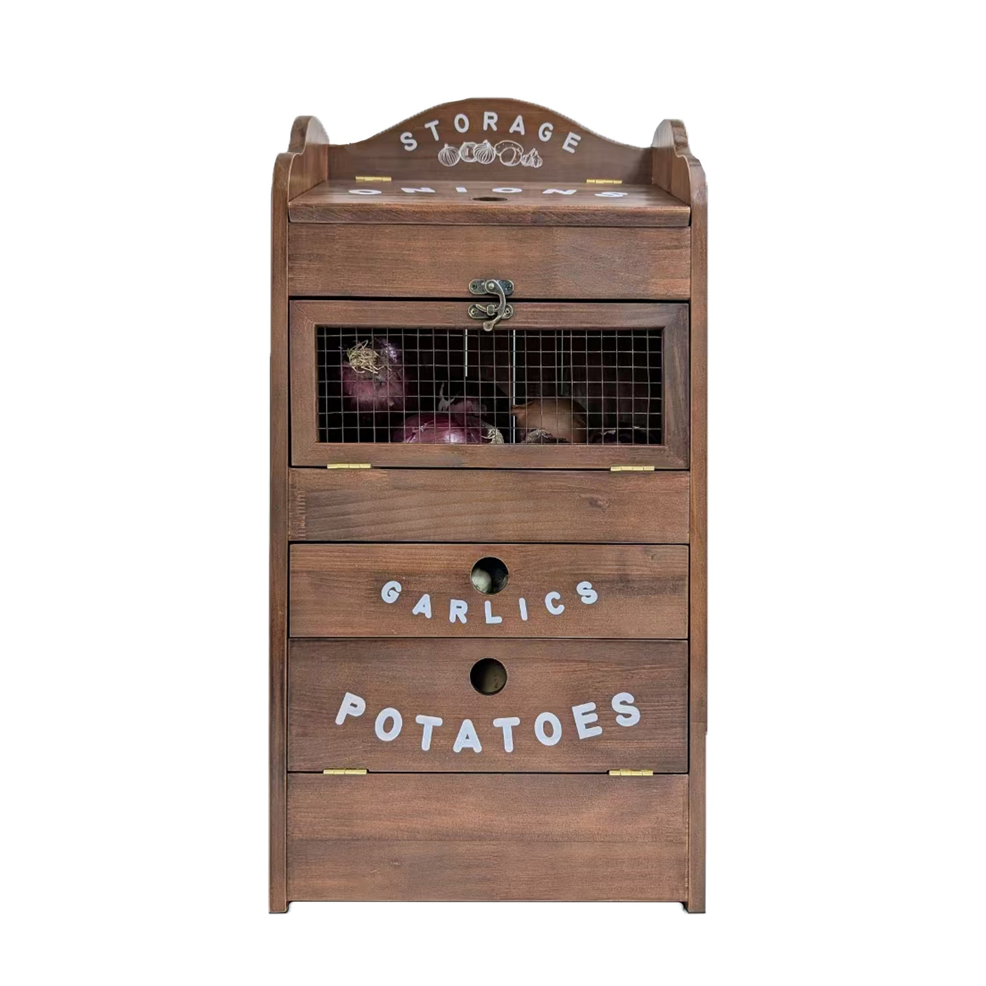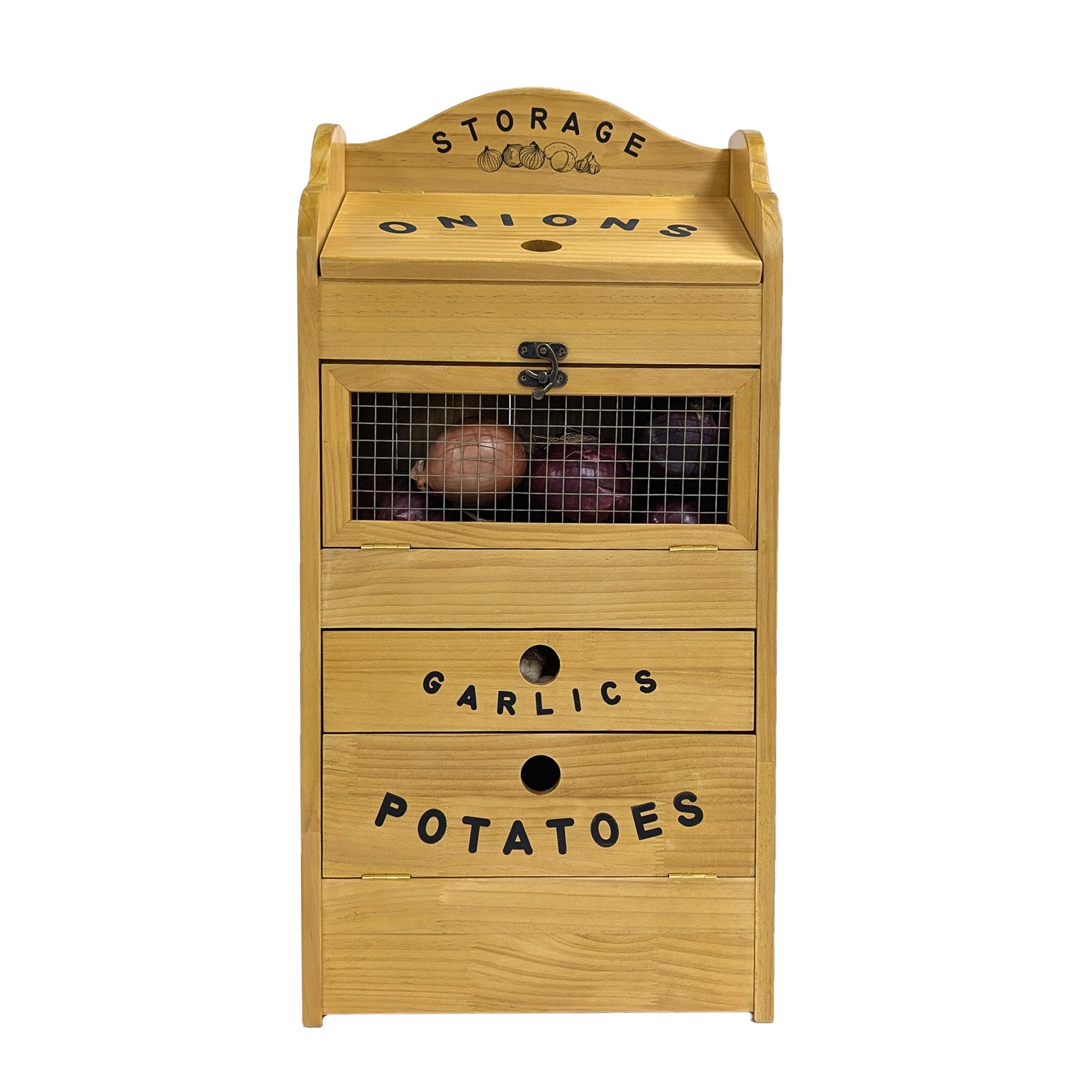 Transform your kitchen into a haven of rustic charm and unmatched organization with our Rustic Pine Wood Potato and Onion Storage Bin with Built-in Garlic Keeper. This thoughtfully designed storage solution offers the best in potato storage, onion storage, and garlic keeping, all neatly consolidated into one elegant yet practical piece. This potato bin is more than just a functional item—its a stylish addition to any kitchen decor. This versatile kitchen storage organizer features separate compartments for potatoes, onions, and garlic, ensuring each vegetable remains fresh and easily accessible. Our potato and onion storage bin boasts ample space to hold substantial quantities of root vegetables while preserving their freshness through optimal air circulation. The built-in garlic keeper not only extends the life of your garlic bulbs but keeps them conveniently close at hand. With its meticulous design, this wooden bin seamlessly blends functionality with aesthetic appeal, giving you the best potato storage experience available on the market today. Say goodbye to cluttered countertops and unsightly plastic bags with our potato onion garlic storage set. This practical bagette alternative can be placed in your pantry, these wood boxes for storage are designed to withstand the demands of everyday use while retaining their rustic beauty over time. Whether youre storing potatoes in a sturdy potato container or organizing onions in an elegant onion keeper, this potato box covers all bases—ensuring everything you need for meal prep is right at your fingertips. Upgrade your culinary space with our Rustic Pine Wood Potato and Onion Storage Bin—a quintessential solution that combines form and function effortlessly. Ideal for any home chef who values both style and practicality, this vegetable bin will revolutionize how you store potatoes, onions, and garlic in the most charming way possible.