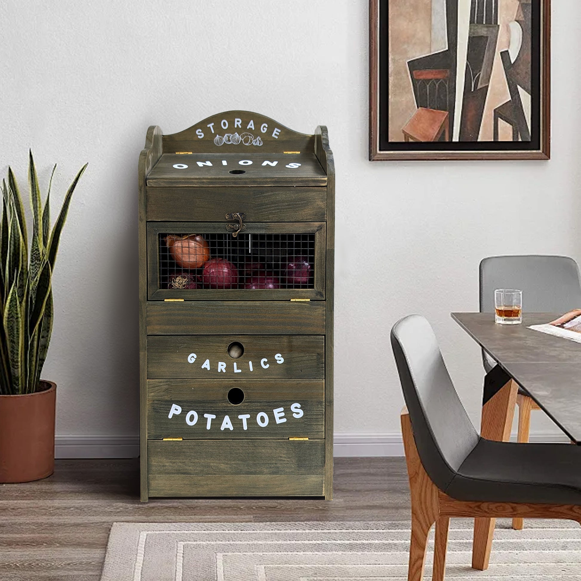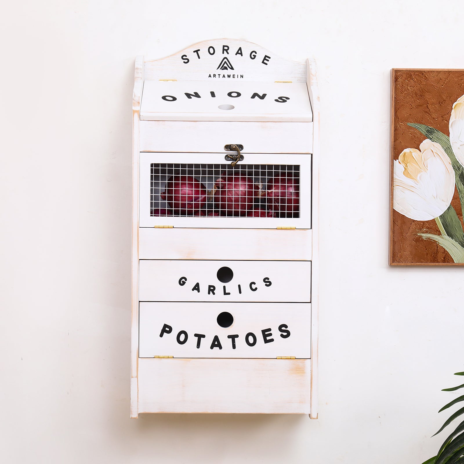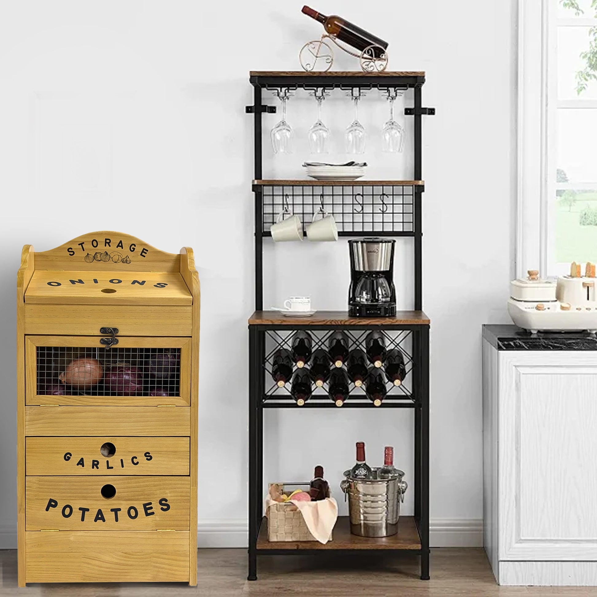 Transform your kitchen into a haven of rustic charm and unmatched organization with our Rustic Pine Wood Potato and Onion Storage Bin with Built-in Garlic Keeper. This thoughtfully designed storage solution offers the best in potato storage, onion storage, and garlic keeping, all neatly consolidated into one elegant yet practical piece. This potato bin is more than just a functional item—its a stylish addition to any kitchen decor. This versatile kitchen storage organizer features separate compartments for potatoes, onions, and garlic, ensuring each vegetable remains fresh and easily accessible. Our potato and onion storage bin boasts ample space to hold substantial quantities of root vegetables while preserving their freshness through optimal air circulation. The built-in garlic keeper not only extends the life of your garlic bulbs but keeps them conveniently close at hand. With its meticulous design, this wooden bin seamlessly blends functionality with aesthetic appeal, giving you the best potato storage experience available on the market today. Say goodbye to cluttered countertops and unsightly plastic bags with our potato onion garlic storage set. This practical bagette alternative can be placed in your pantry, these wood boxes for storage are designed to withstand the demands of everyday use while retaining their rustic beauty over time. Whether youre storing potatoes in a sturdy potato container or organizing onions in an elegant onion keeper, this potato box covers all bases—ensuring everything you need for meal prep is right at your fingertips. Upgrade your culinary space with our Rustic Pine Wood Potato and Onion Storage Bin—a quintessential solution that combines form and function effortlessly. Ideal for any home chef who values both style and practicality, this vegetable bin will revolutionize how you store potatoes, onions, and garlic in the most charming way possible.